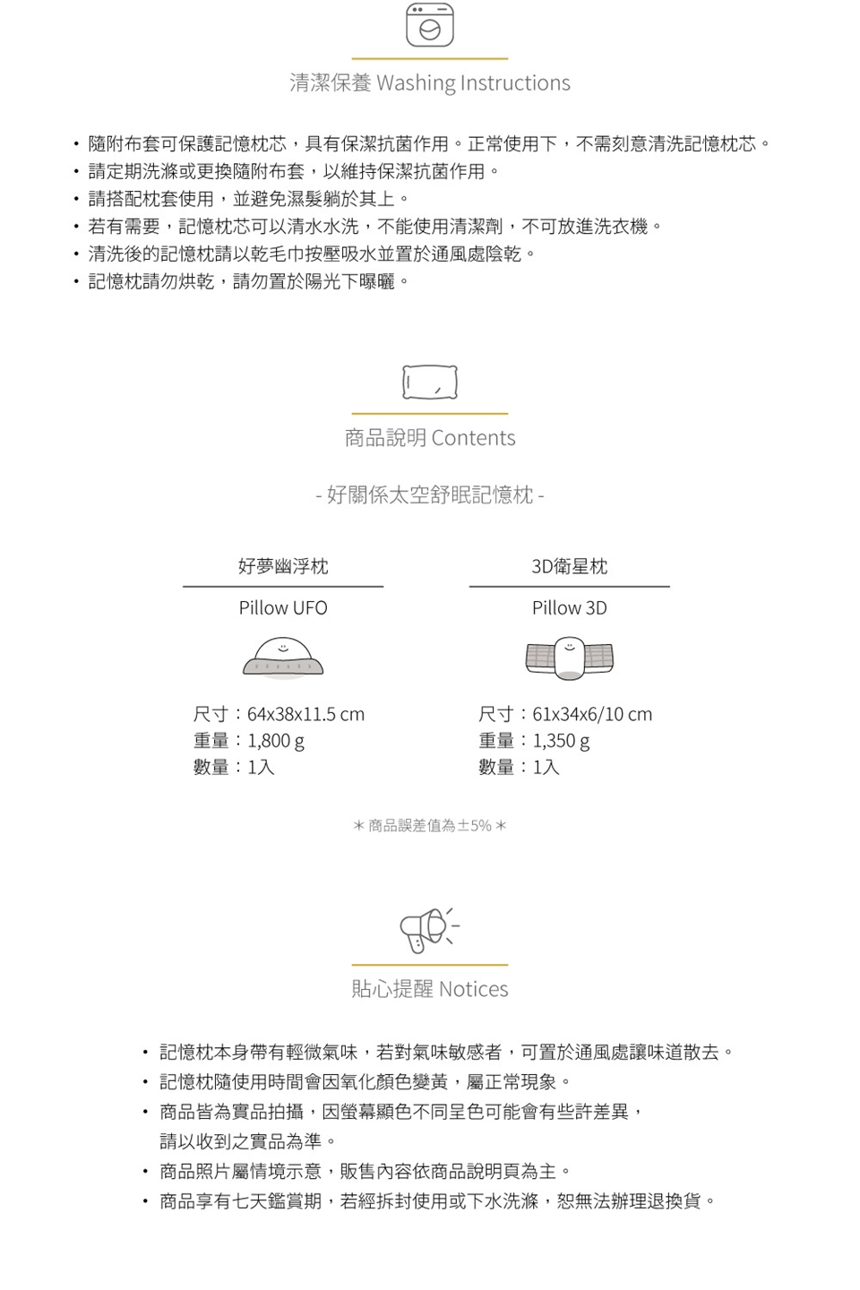 ・若有需要,記憶枕芯可以清水水洗,不能使用清潔劑,不可放進洗衣機。