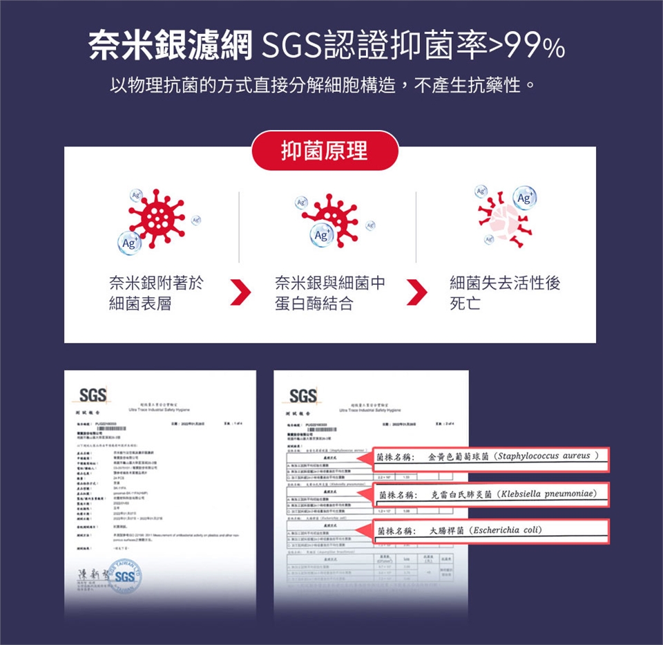 ◆奈米銀竹炭抑菌濾網,SGS測試有效抑制大腸桿菌、金黃色葡萄球菌、克雷白氏肺炎菌達99%以上。