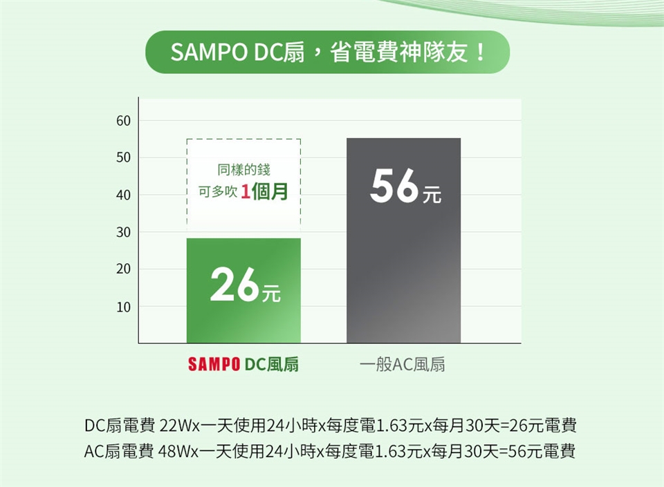 ◆省電效能提高50%,每月使用不到一度電。(以最小風速1小時3.5Wx1天使用8小時x1月使用30天計算)