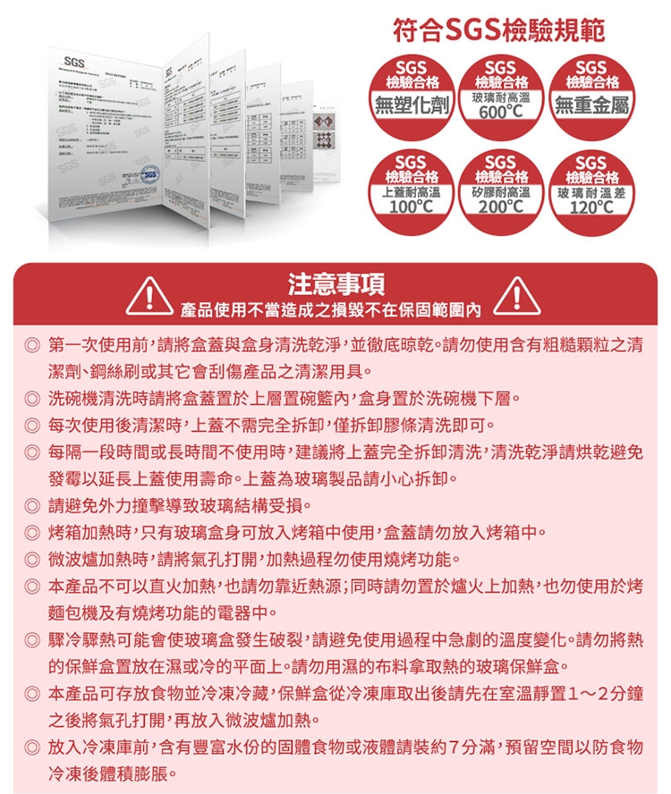 1.請勿用於明火直接加熱,以防止產品破損;堆疊收納時請加上蓋子以免產品破裂。