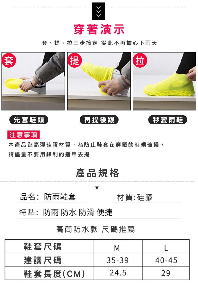 本產品為高彈性硅膠材質,為防止鞋套在穿戴的時候破損,請儘量不要用鋒利的指甲去提