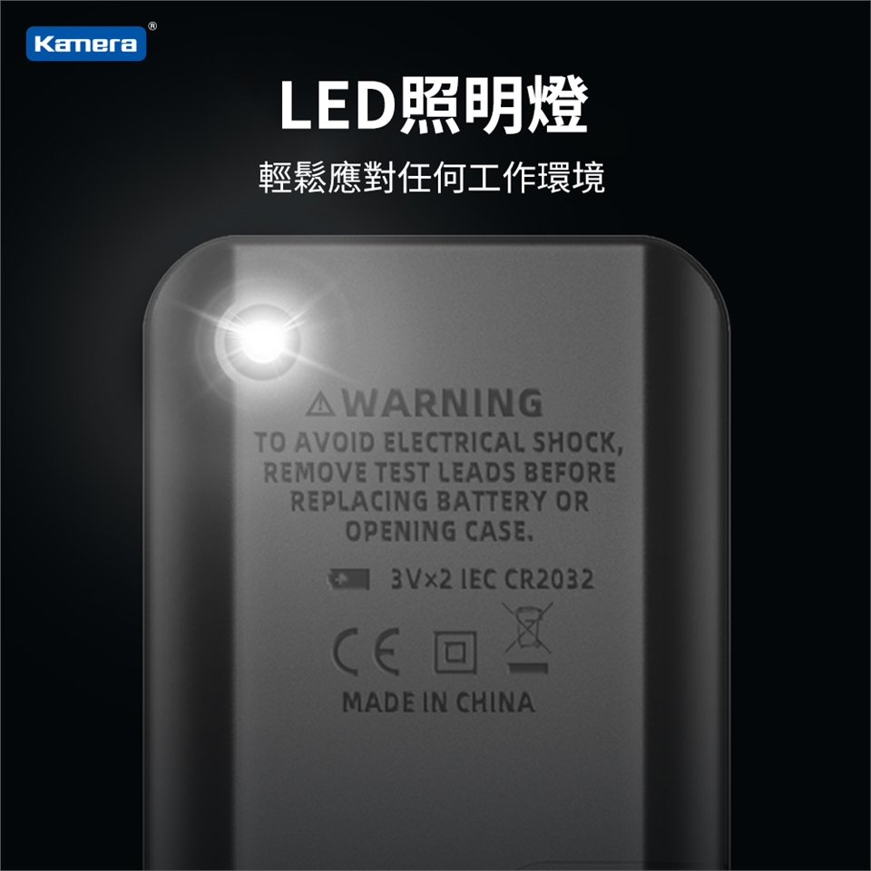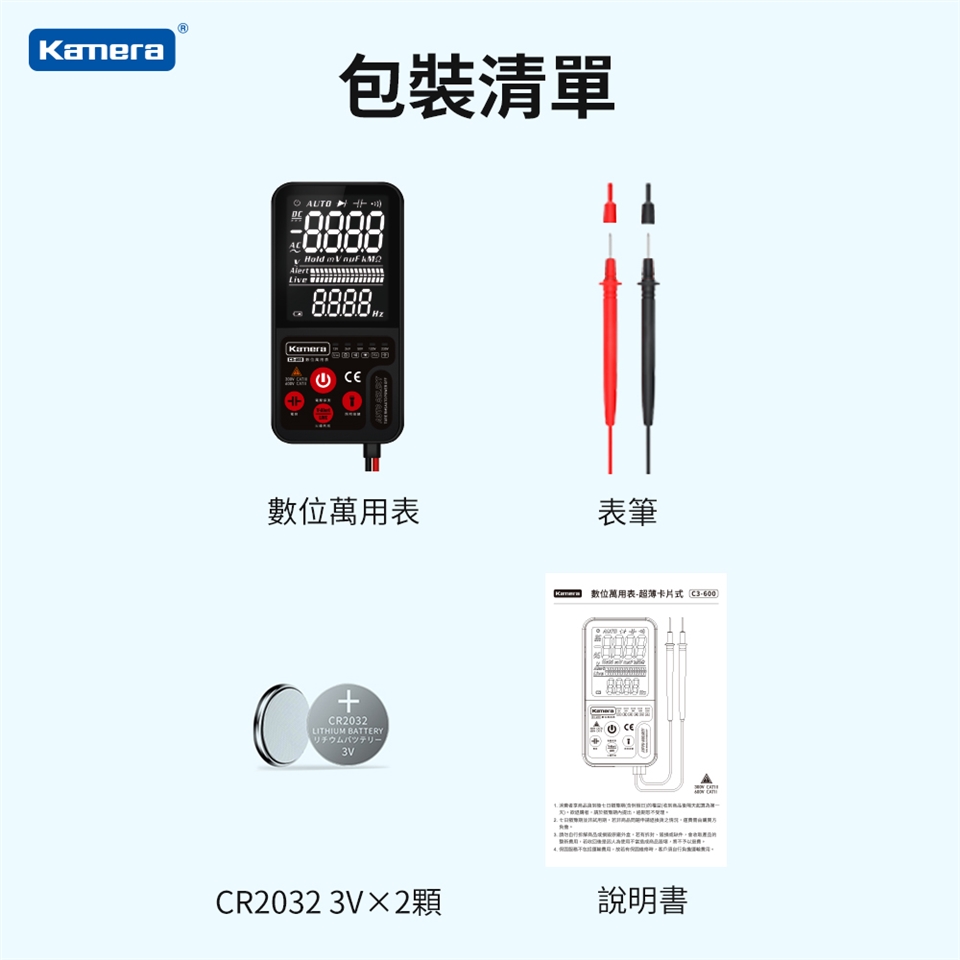 包裝內容:數位萬用表、表筆、CR2032 3V×2顆、說明書