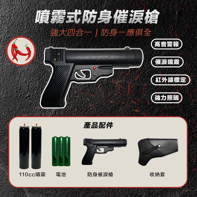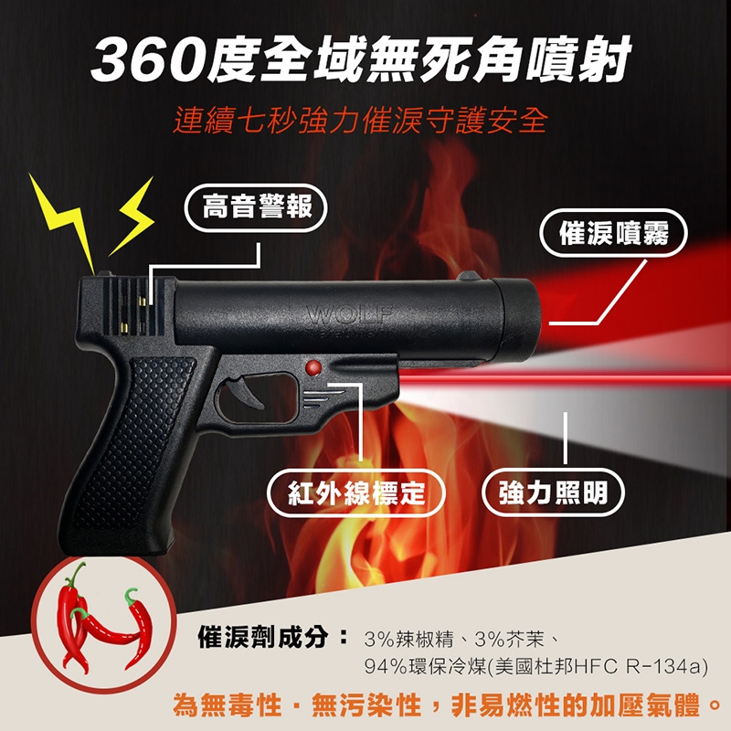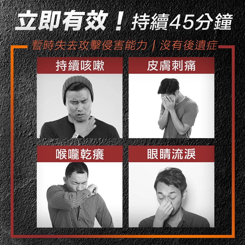 效果:使歹徒咳嗽,流眼淚,喉嚨乾癢,皮膚會刺痛等症狀,暫時失去攻擊與侵害能力,沒有後遺症,立即有效,約45分鐘後才可恢復。