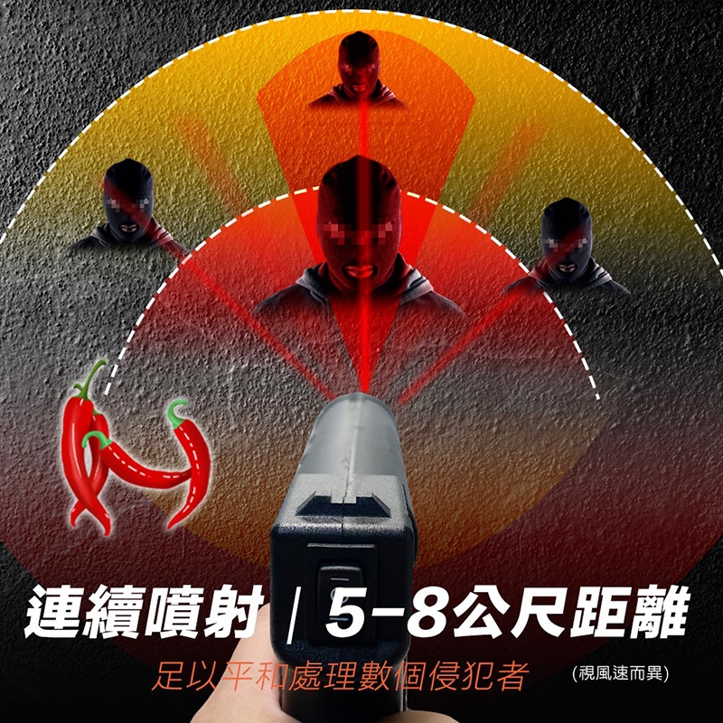 2.對準歹徒的臉部按下噴頭,瞬間噴出辣椒液體,使歹徒受到強烈的感官刺激,如打噴嚏、流淚和咳嗽不止,使歹徒失去攻擊力,則盡速離開現場。
