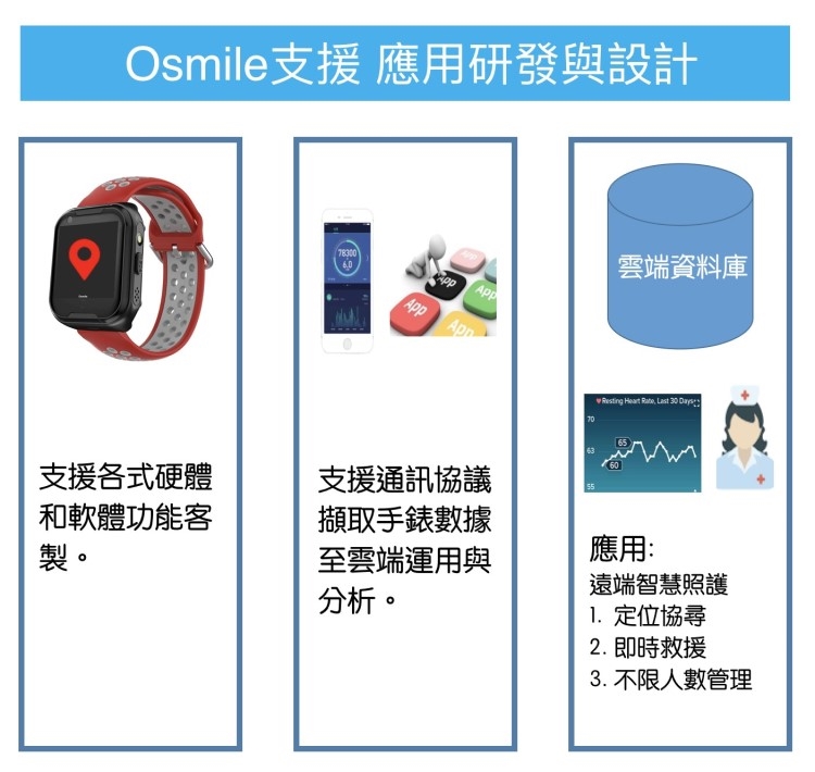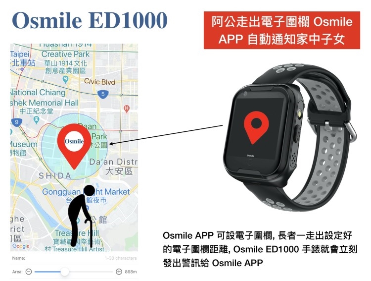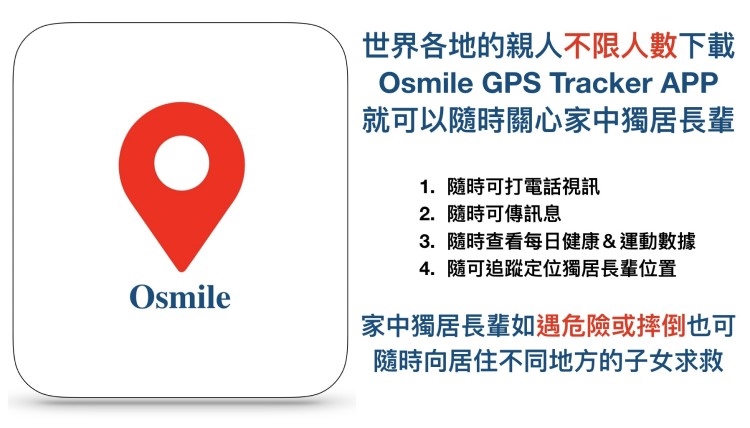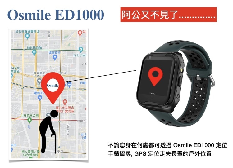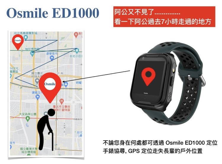 基本上患有失智症的老人家, 只需帶著 Osmile ED1000 手錶即可, 家人不限人數下載 Osmile APP,即可遠端定位走失的老人家, 和以下的所有全方位遠端關心功能: