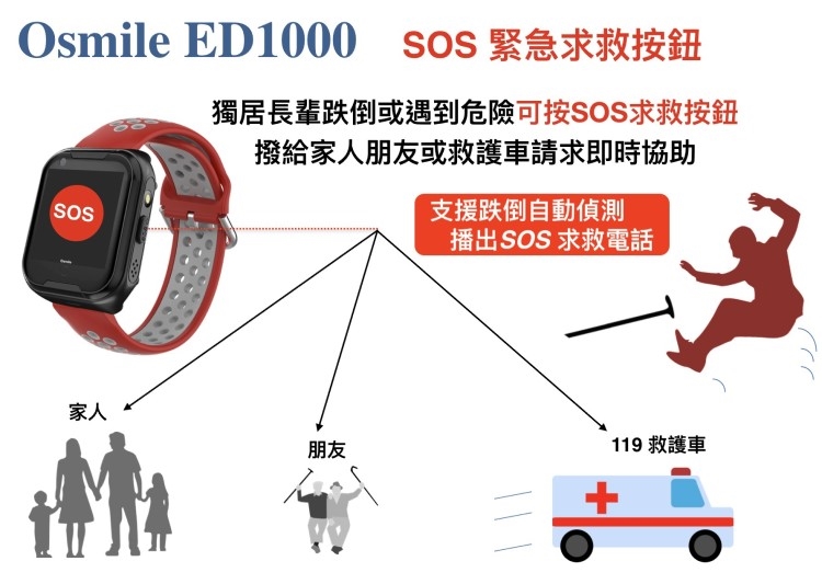 1.跌倒自動偵測 (支援老人跌倒偵測, 自動發出求救訊息至手機簡訊/Osmile APP並輪撥電話給設定的緊急聯絡人)