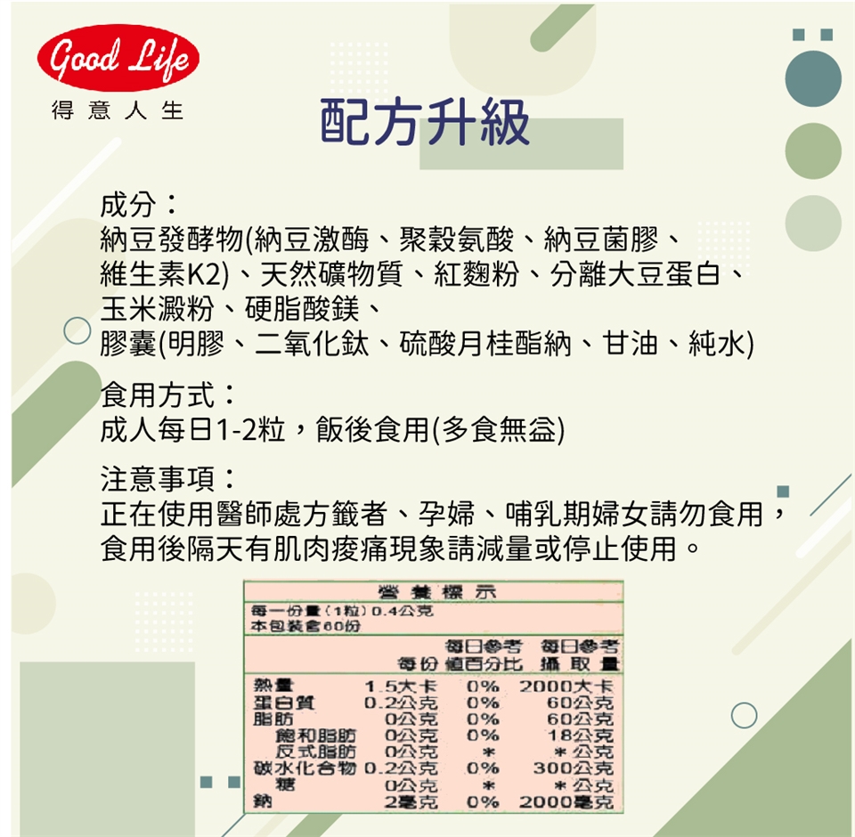 正在使用醫師處方籤者、孕婦、哺乳期婦女請勿食用,食用後隔天有肌肉痠痛現象請減量或停止使用。