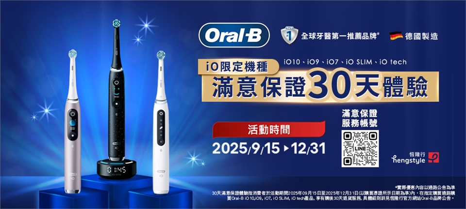 ●消費者於活動期間,於恆隆行直營之指定通路購買Oral-B iO系列指定型號電動牙刷享有Oral-B滿意保證活動之「30日滿意保證」。