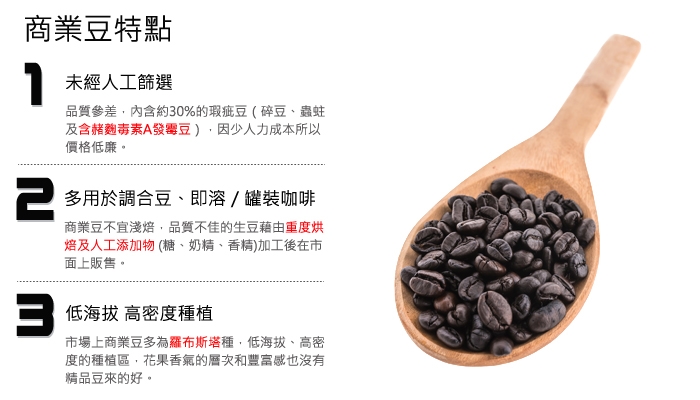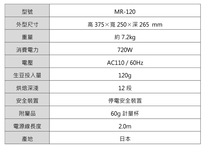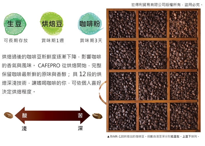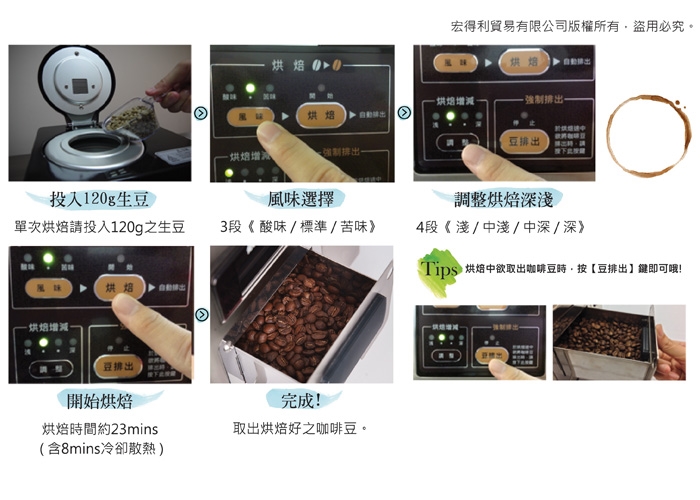 烘豆機提供少量烘焙,故一次烘焙量為120g,烘焙程度從酸至苦、淺至深