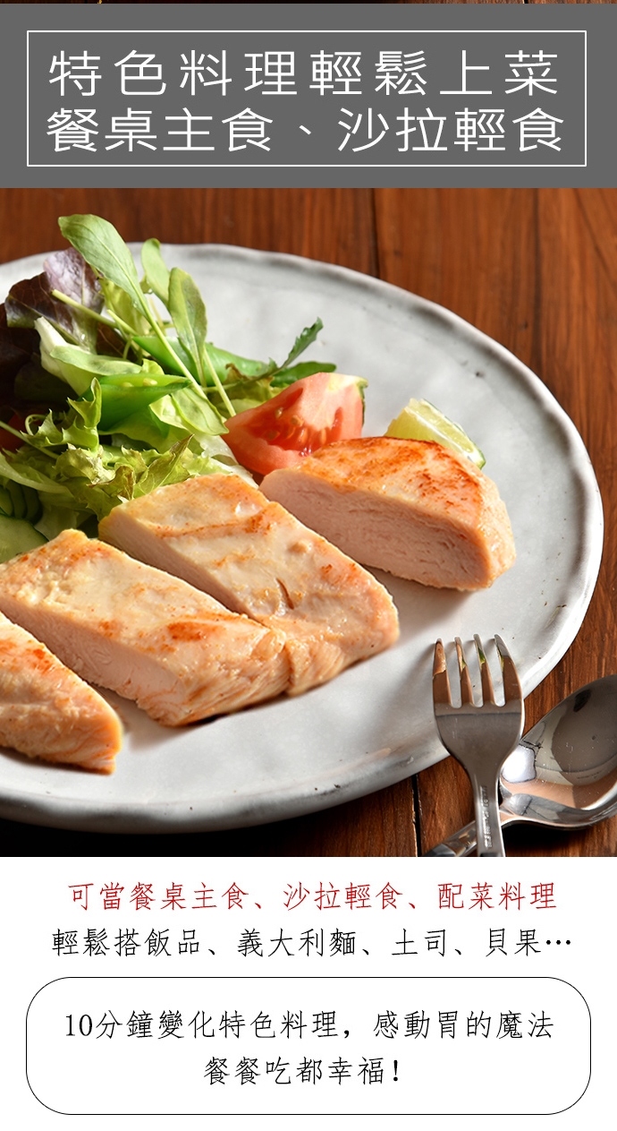 鮮嫩去骨雞胸肉可當餐桌主食、沙拉輕食、配菜料理,輕鬆搭飯品、義大利麵、土司、貝果…,10分鐘變化特色料理,感動胃的魔法!餐餐吃都幸福!