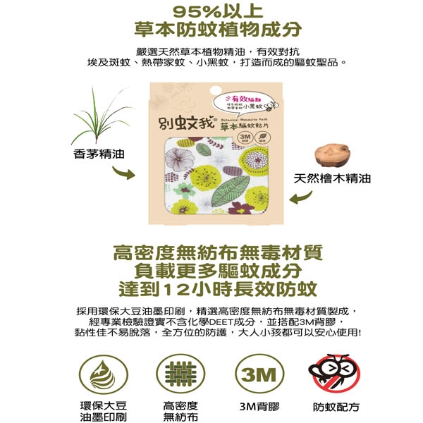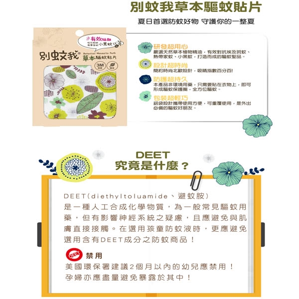 3.請勿直接貼於皮膚上,本品為揮發性天然防蚊精油,勿放置於陽光下或高溫處保存。