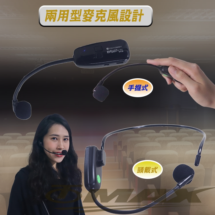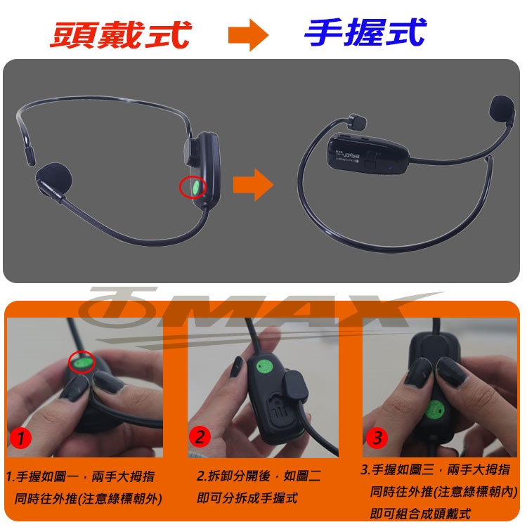 3.兩用型麥克風設計,可作頭戴式,支架拆卸後即成為手握式
