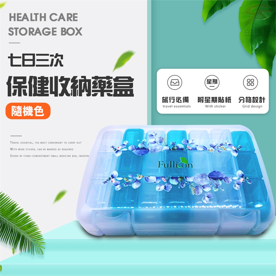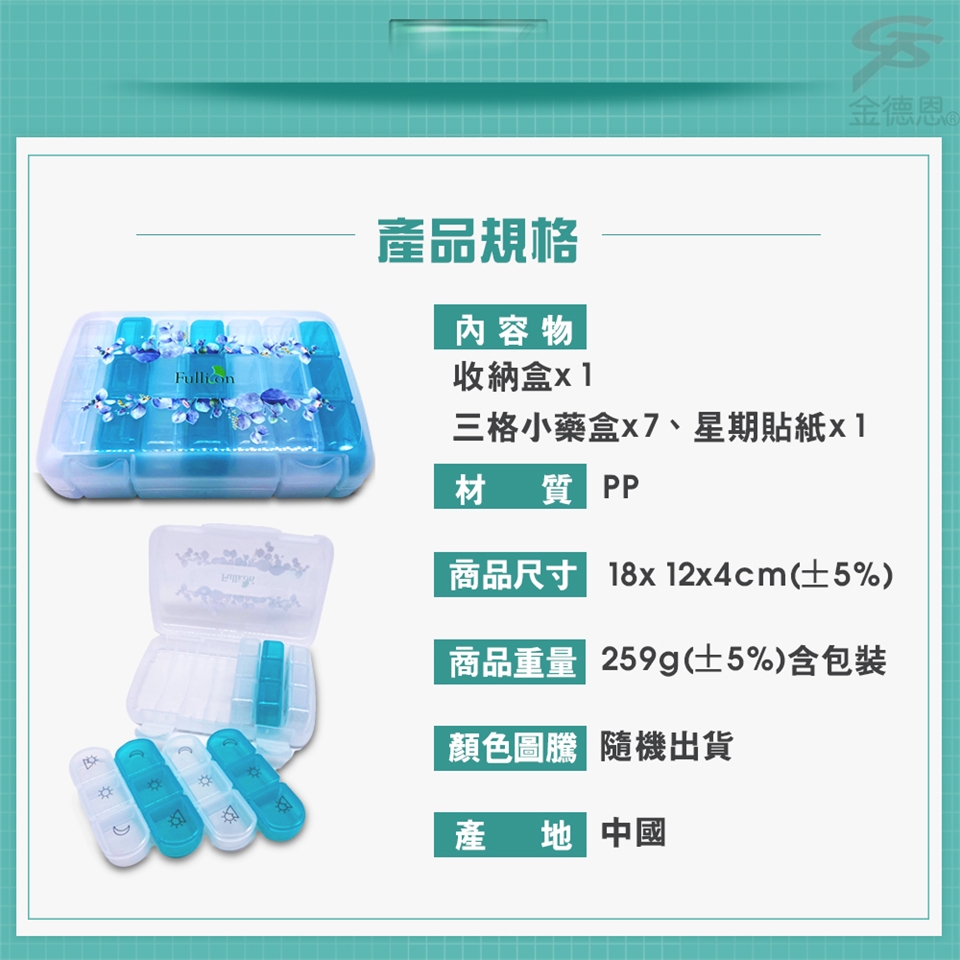 內容物:收納盒x1、三格小藥盒x7、星期貼紙x1