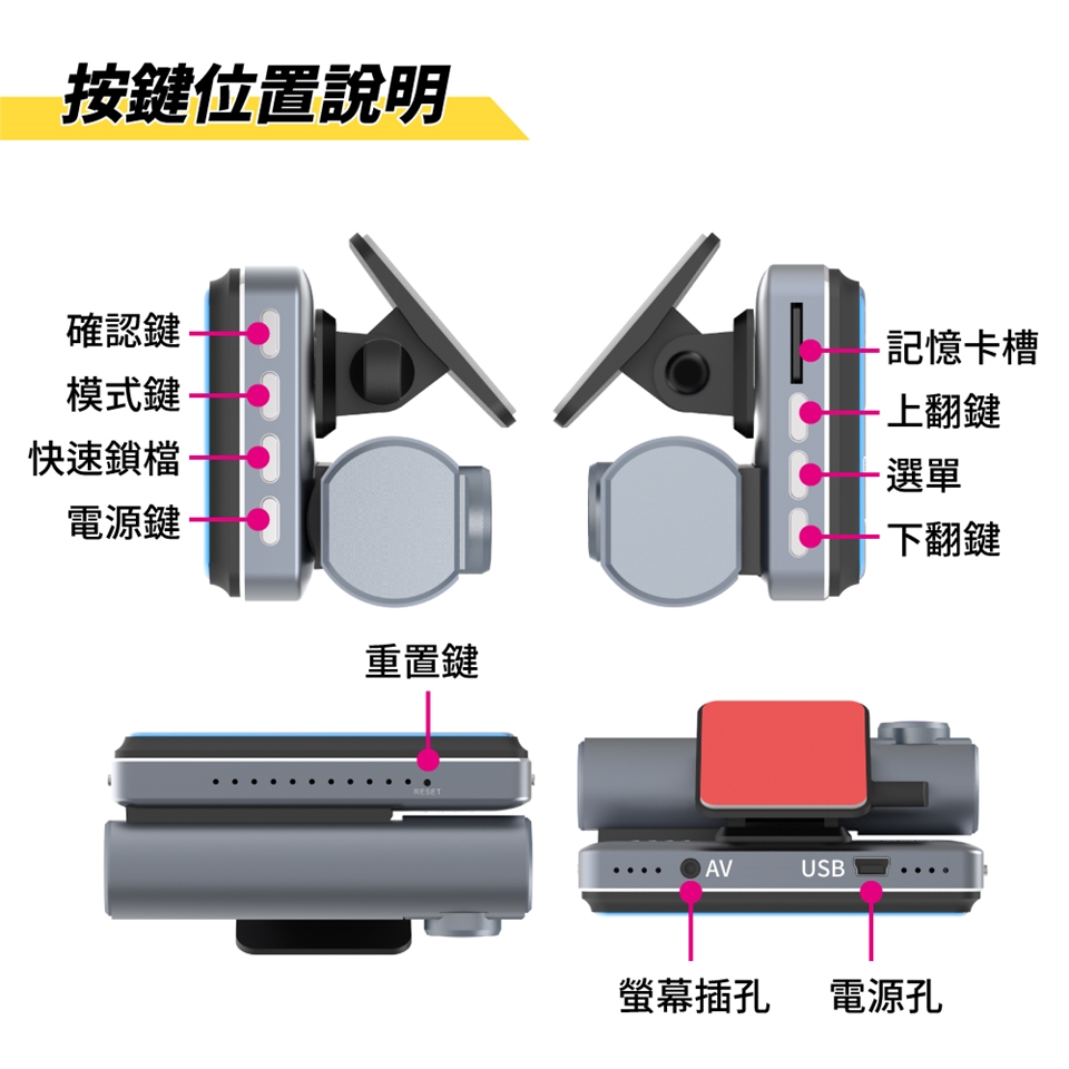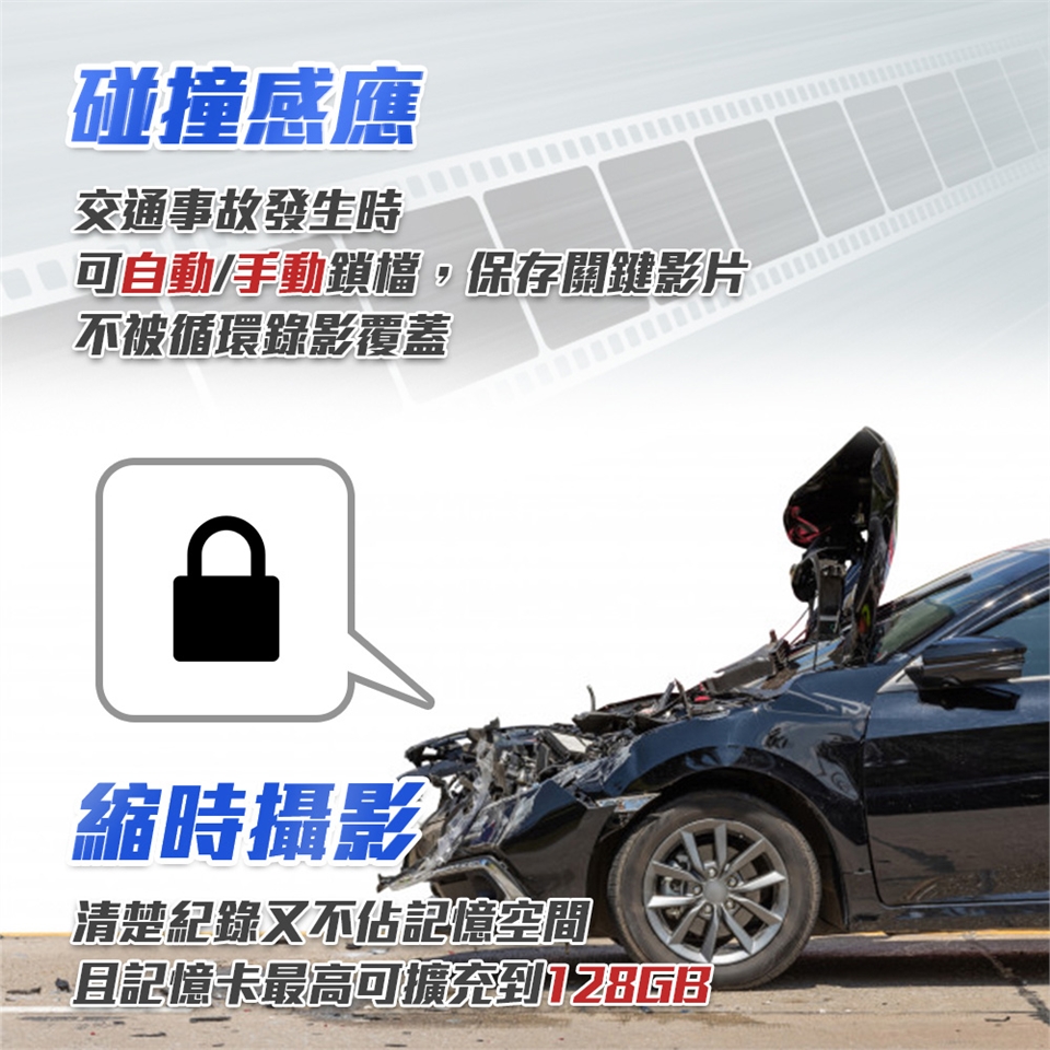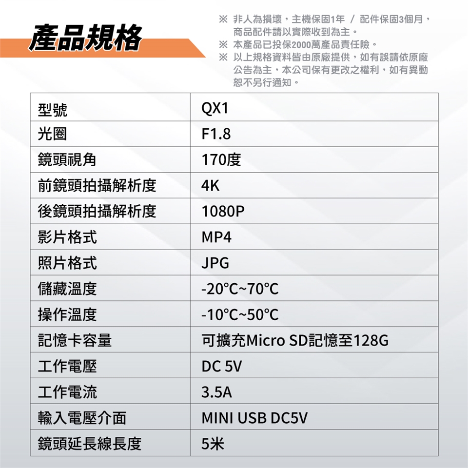 配件:主機/1080P後鏡頭/5m後鏡頭延長線/3.5m車充/Mini USB線/保卡/說明書