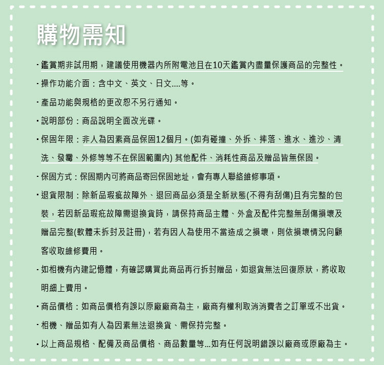 ※鑑賞期非試用期,建議使用機器內所附電池且在10天鑑賞內盡量保護商品的完整性。