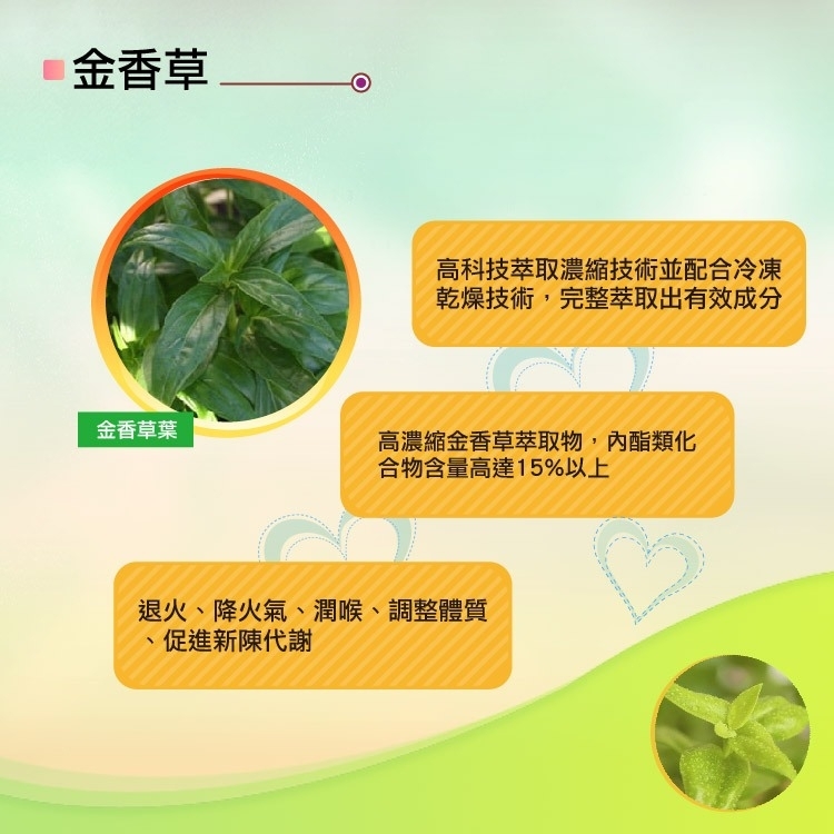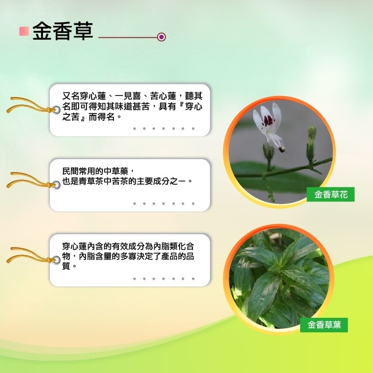 金香草又名穿心蓮、一見喜、苦心蓮,是民間常用的中草藥,也是青草茶中苦茶的主要成分之ㄧ。金香草內含的有效成分為內酯類化合物,內酯含量的多寡決定了產品的品質,本產品透過高科技萃取濃縮技術並配合冷凍乾燥技術,完整萃取出金香草的有效成分,其中穿心蓮內酯(Andrographolide)含量高達15%以上,可達到退火、降火氣、調整體質、促進新陳代謝、潤喉的保健目的,是純天然的保健食品。