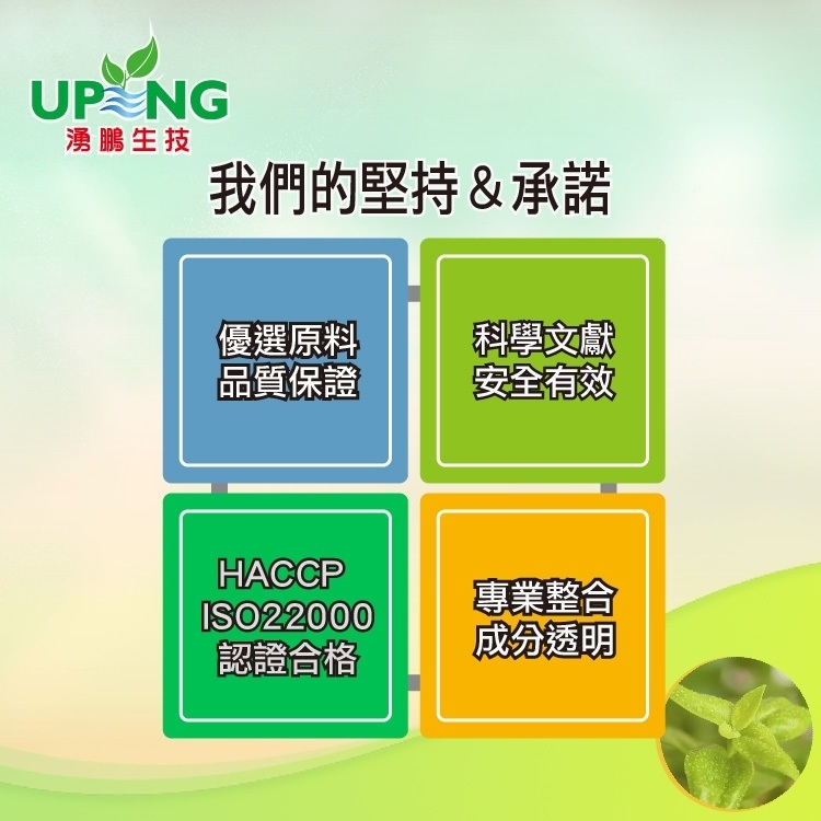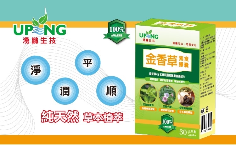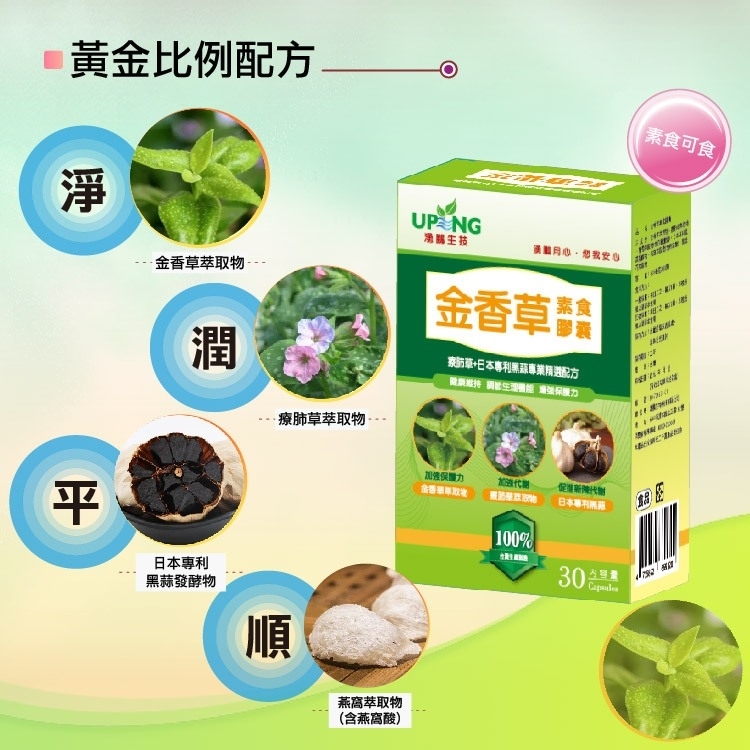 本產品已金香草為主軸,搭配療肺草萃取物、葡萄萃取物(含白藜蘆醇)、日本專利黑蒜發酵物、燕窩萃取物(含燕窩酸)、紫錐花萃取物等黃金比例配方,具有淨、潤、平、順的效果,同時採用素食膠囊,素食族群可以安心食用,是一個健康維持,增加保護力的保健食品。