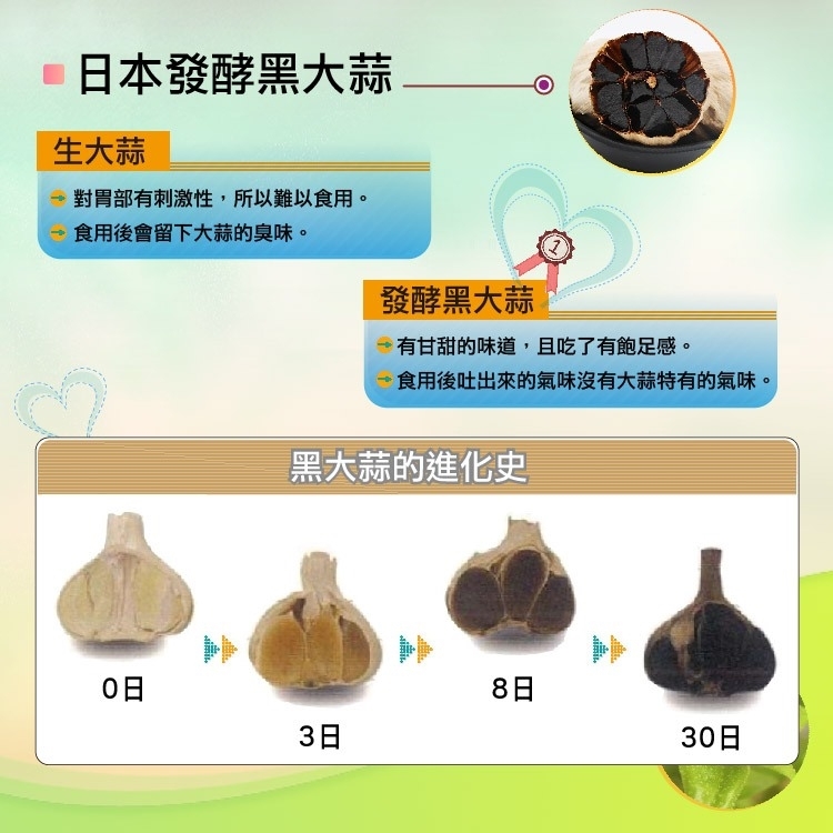 黑蒜頭是由生大蒜發酵而來,整體發酵製作過程大約60天,包括發酵15天,熟成15天,乾燥30天,過程中不需要添加任何的水份、糖、或是菌種,發酵後具有甘甜的味道,食用後沒有大蒜特有的氣味。黑蒜發酵過程中會產生多種人體必須胺基酸,對於人體健康達到很好的保健效果。