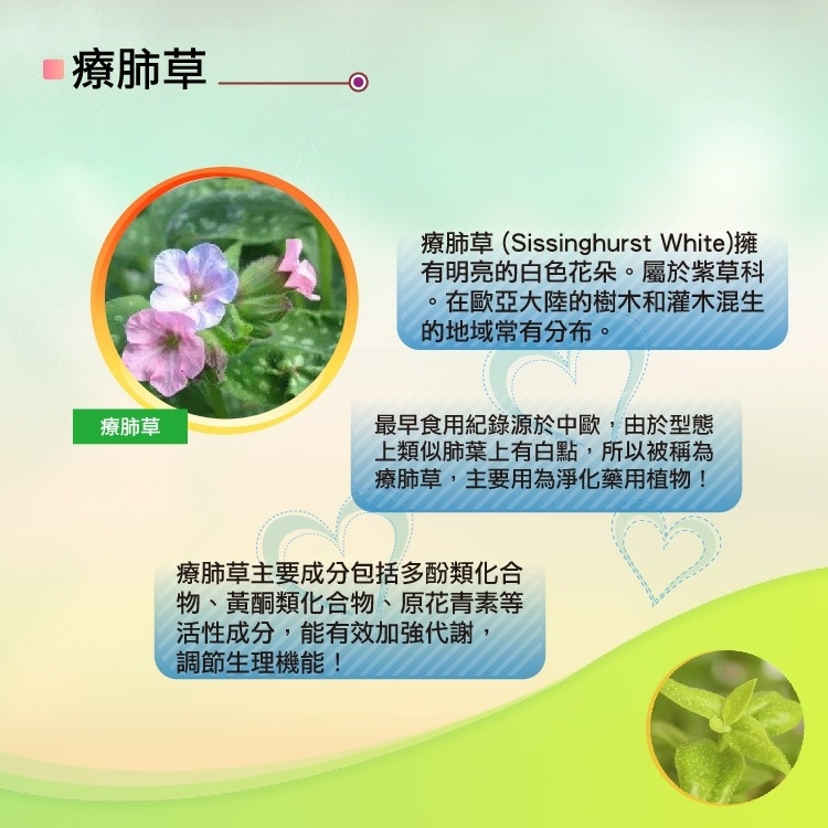 療肺草 (Sissinghurst White)擁有明亮的白色花朵,屬於紫草科,在歐亞大陸的樹木和灌木混生的地域常有分布。最早食用紀錄源於中歐,由於型態上類似肺葉上有白點,所以被稱為療肺草,主要用為淨化藥用植物。療肺草主要成分包括多酚類化合物、黃酮類化合物、原花青素等活性成分,能有效加強代謝、調節生理機能。