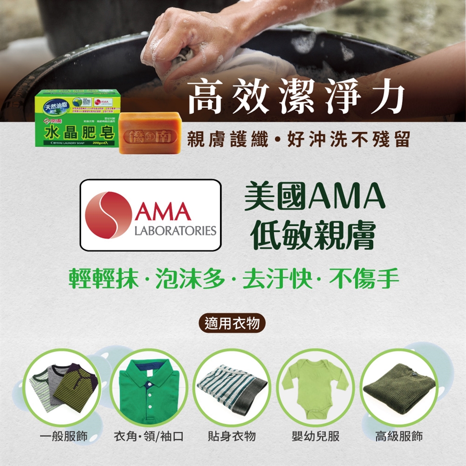 將欲洗的衣物浸濕後,使用水晶肥皂直接塗抹,再以雙手搓揉,潔淨後再以清水沖淨即可。