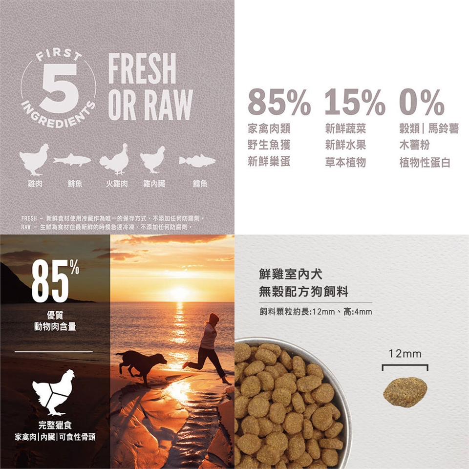 85%肉類含量,前5大主要成分為新鮮或生鮮的放養雞肉、放養火雞肉、雞內臟 (肝,心)、完整鯡魚、完整鱈魚。加上蘋果、梨子、南瓜、胡蘿蔔等新鮮完整蔬果。