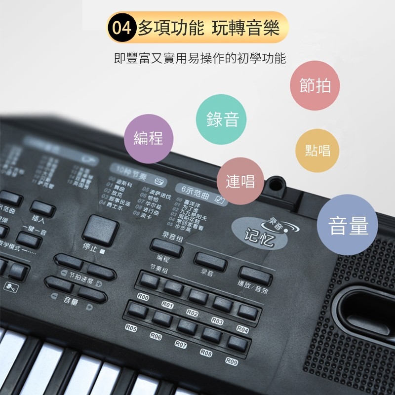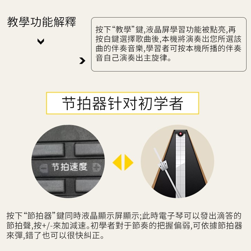 教學功能: 內置一鍵教學功能(外置琴鍵貼+樂譜)