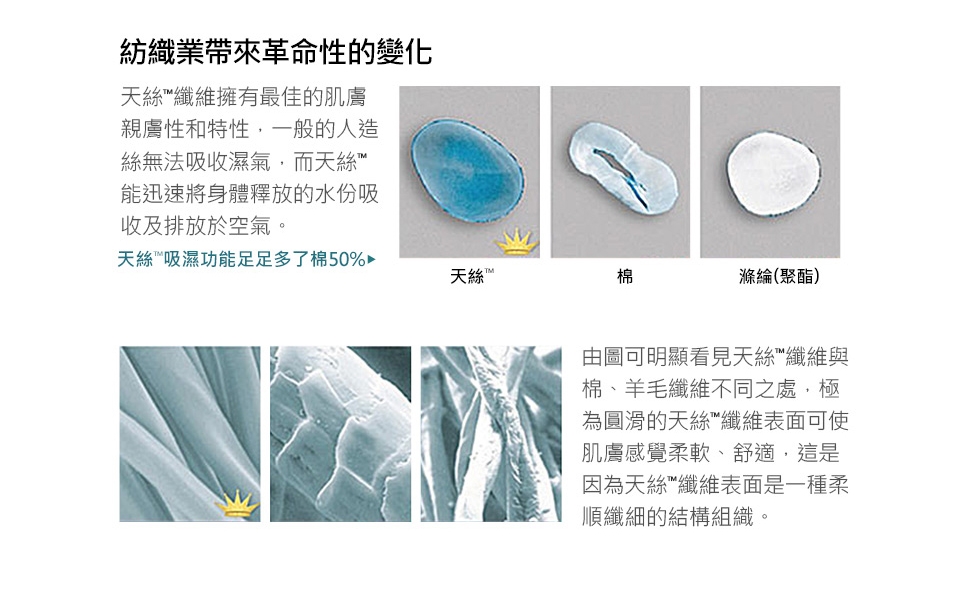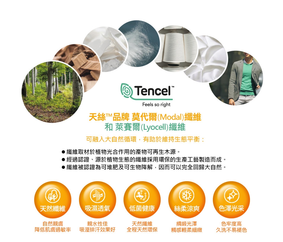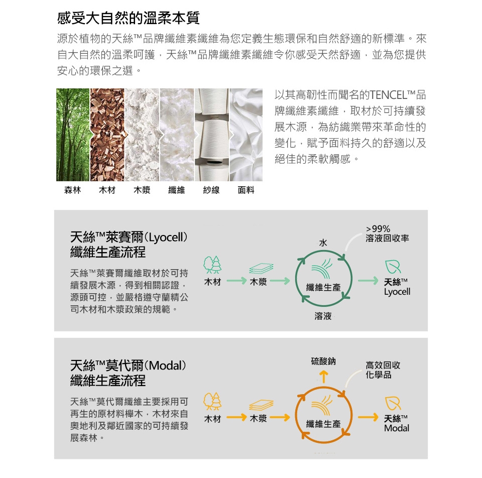 莫代爾(Modal):莫代爾屬於纖維素纖維,是從木材中提取出來的木漿經過加工後制得的一種布料,原料環保且加工過程所使用的溶劑99%以上可以回收,整個生產過程也不會產生污染,布料能夠在土壤中自然降解,環保又天然。莫代爾面料表面有一種絲面光澤,擁有絕佳的柔軟手感,天然纖維自然親膚,降低肌膚過敏率,本身具有良好柔軟性和優良吸濕性,其強韌性、柔軟性、吸濕透氣性、染色性、染色牢度均優於純棉產品,且觸感清涼柔軟舒適也擁有絕佳的抗皺能力。