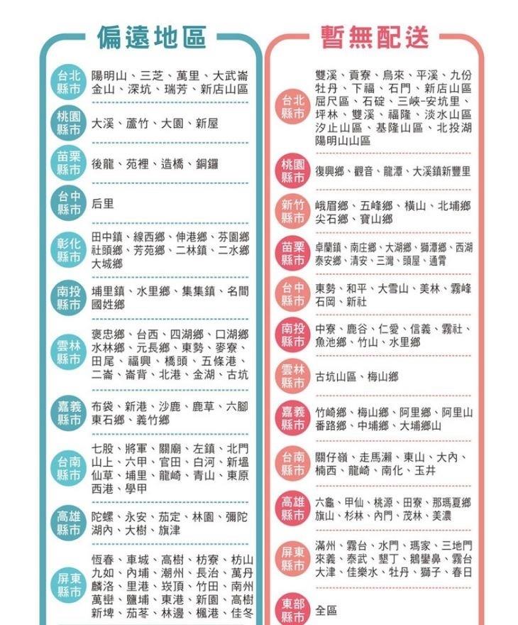 (花蓮全區,屏東全區,南投全區,台東全區和【暫無配送區】皆無運送服務)。