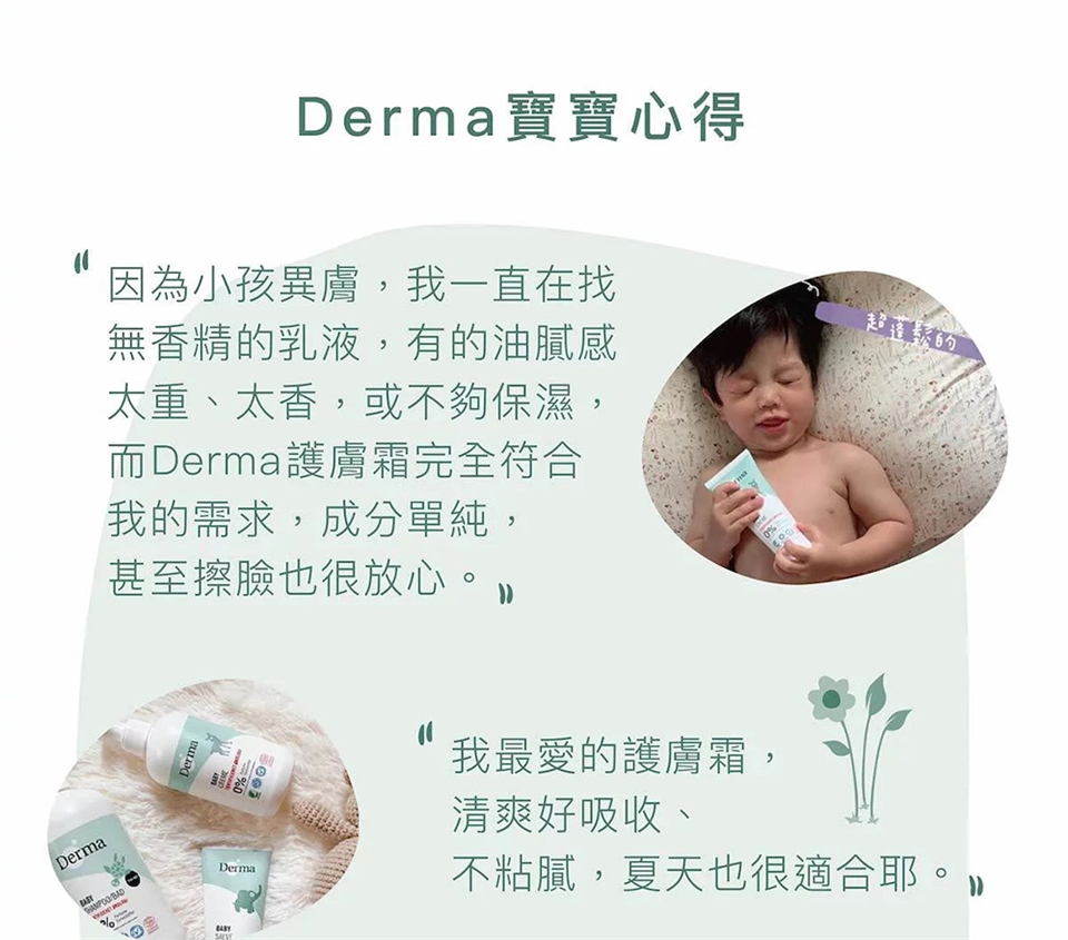 用法:於洗澡後取適量產品,輕輕搓揉於寶寶皮膚上,建議先塗抹Derma滋潤嬰兒油使用以達最佳效果。