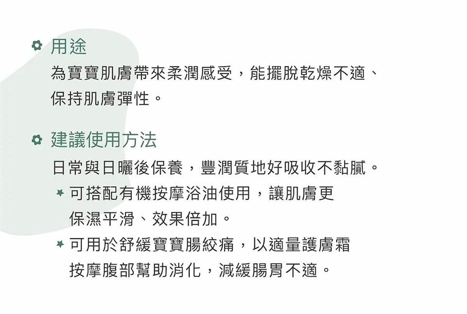 用途:滋潤肌膚,預防肌膚乾燥。