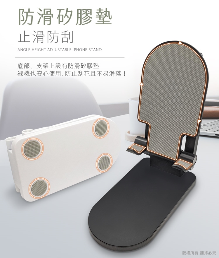 底座四角防滑使用更加平穩,支架上設有矽膠保護不易刮花手機,