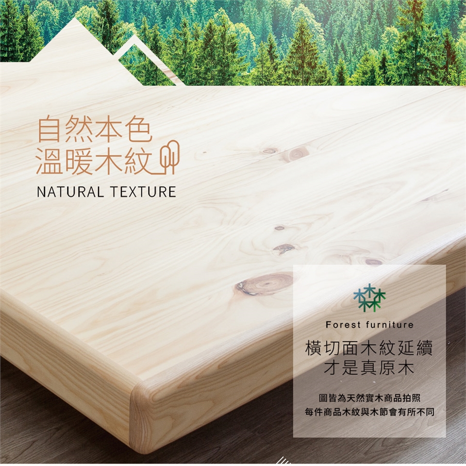 森林家具嚴格把關每一個細節,堅持選用高品質天然原木、安全無毒塗料,100%真材實料讓每件森林家具都擁有獨一無二的天然細膩紋理,打造具有大自然般的美好舒適居家空間。