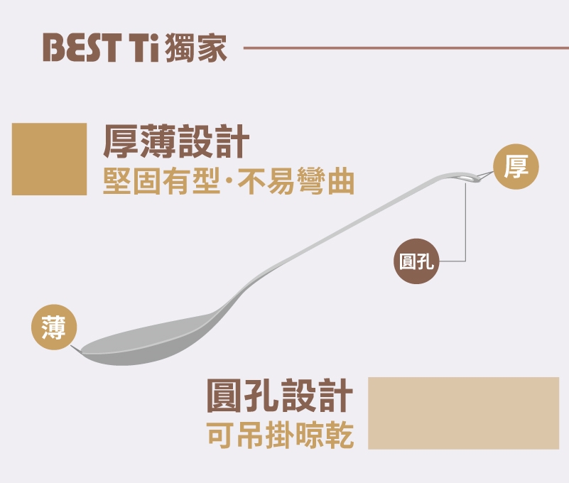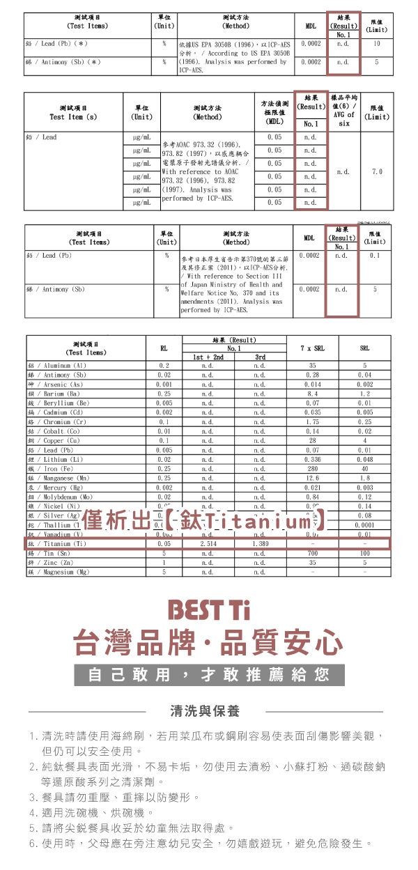 2.純鈦餐具表面光滑,不易卡垢,勿使用去漬粉、小蘇打粉、過碳酸鈉等還原酸系列之清潔劑,這些清潔劑會把二氧化鈦薄膜破壞導致褪色,出現鈦原色,雖一樣安全無毒但影響美觀。