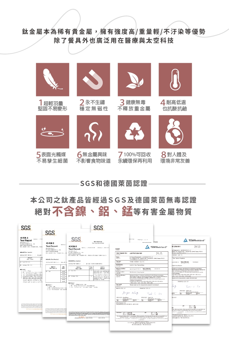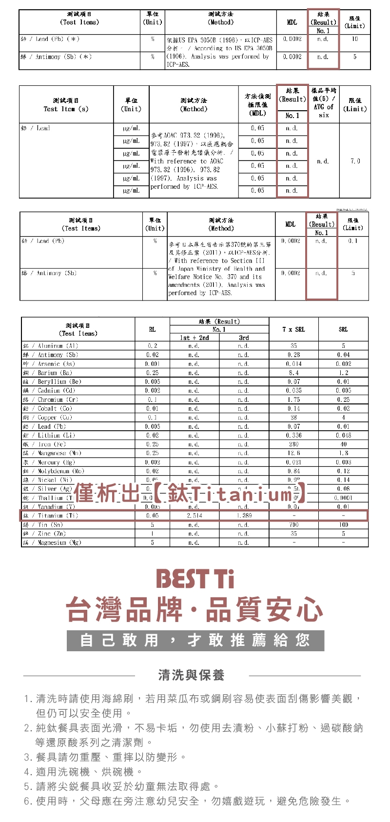 2.純鈦餐具表面光滑,不易卡垢,勿使用去漬粉、小蘇打粉、過碳酸鈉等還原酸系列之清潔劑,這些清潔劑會把二氧化鈦薄膜破壞導致褪色,出現鈦原色,雖一樣安全無毒但影響美觀。
