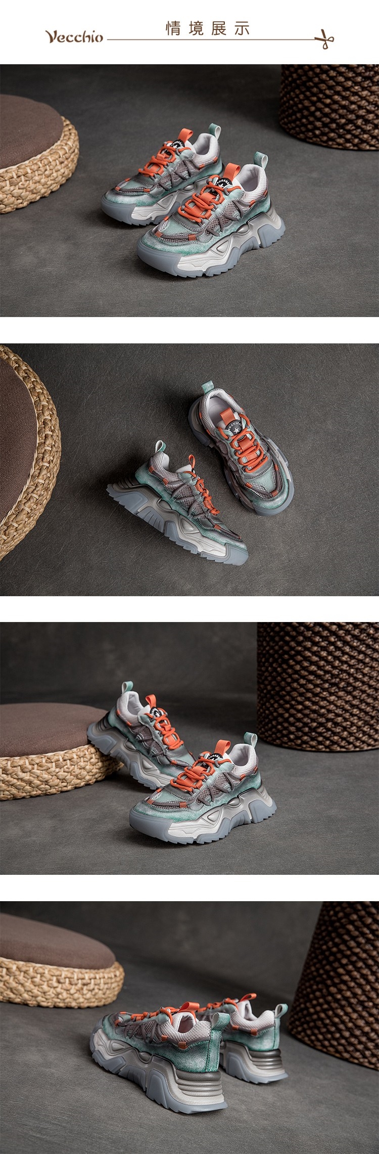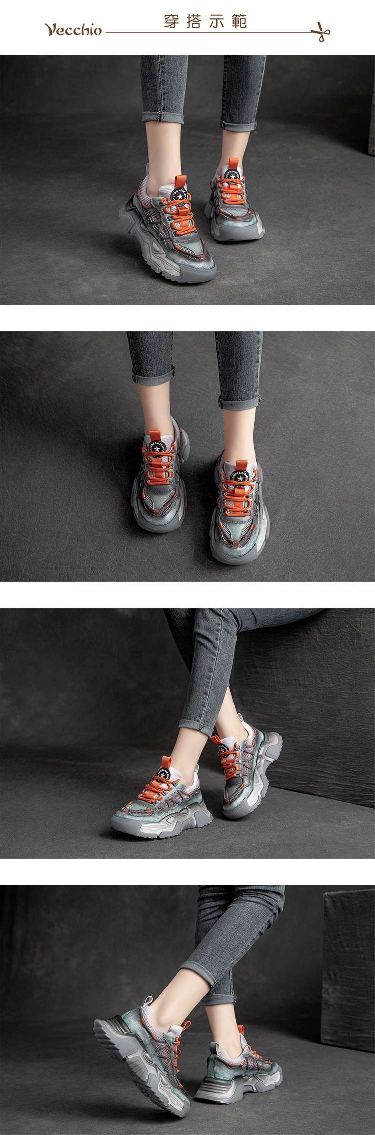 【VECCHIO】老爹鞋 厚底老爹鞋/真皮頭層牛皮縷空網布拼接個性撞色厚底老爹鞋 綠