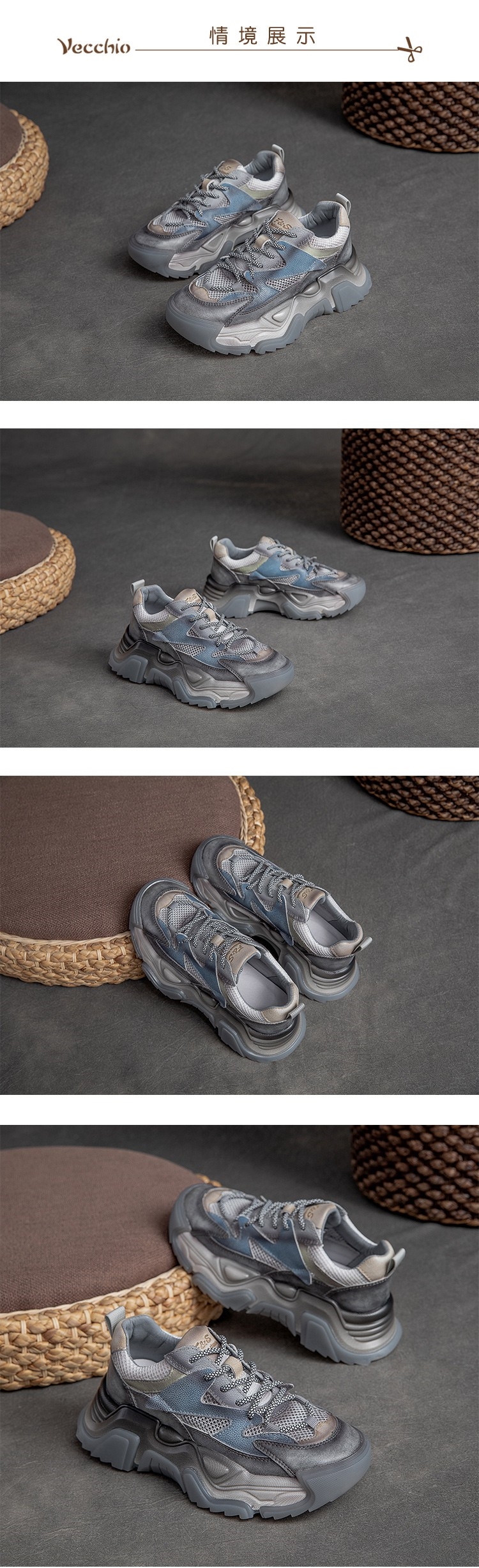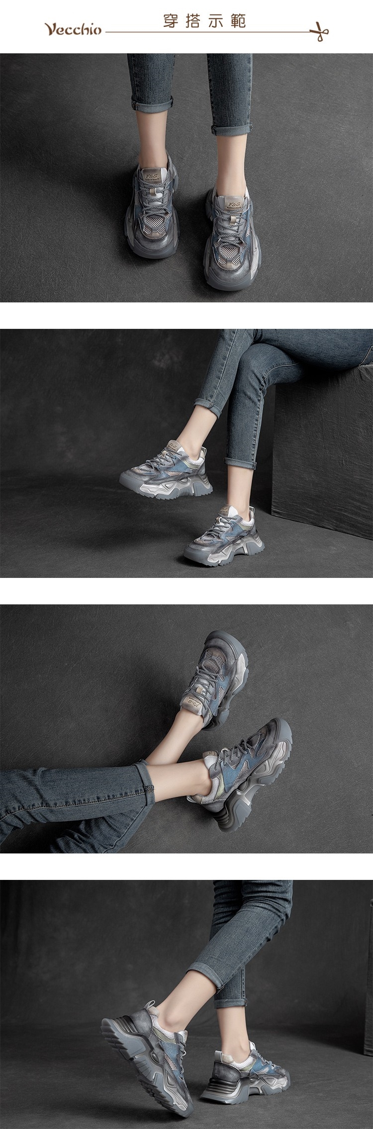 【VECCHIO】老爹鞋 厚底老爹鞋/真皮頭層牛皮透氣網布撞色拼接時尚厚底老爹鞋 藍