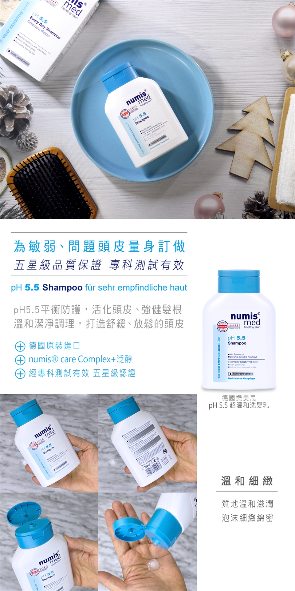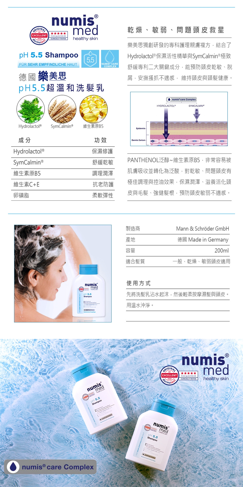 溫和清潔調理敏弱頭皮,打造舒緩、放鬆的頭皮。含樂美思獨創專科護理複方(numis® care Complex)、泛醇與活性精華成分,有效平衡pH質、活絡頭皮,安撫頭皮乾敏不適,適合天天使用。
