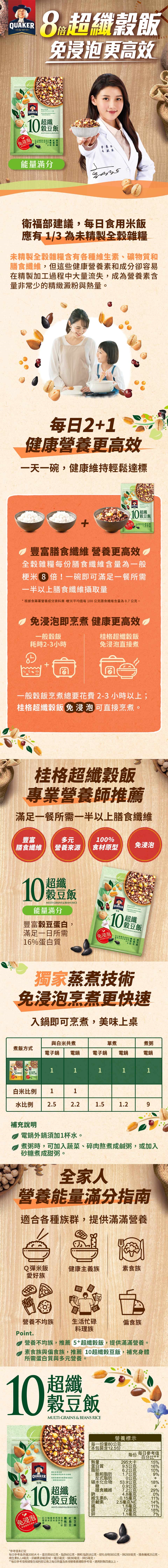 桂格免浸泡10超纖穀豆飯,獨家蒸煮技術,保留穀麥原型與多元營養,一碗滿足一餐所需約一半的膳食纖維及蛋白質攝取量!