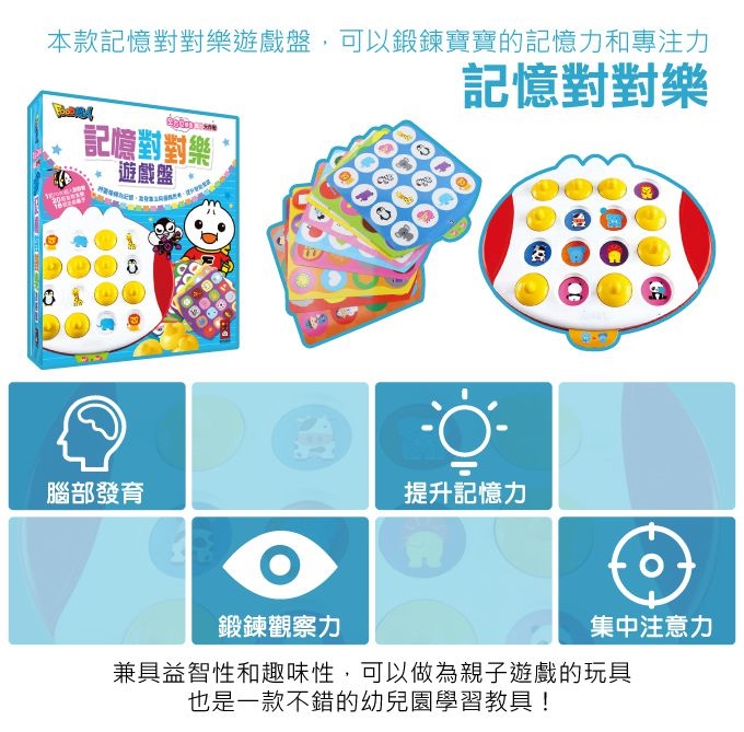記憶力與專注力是一切學習的開始。將具體圖像轉為抽象記憶,藉由遊戲訓練觀察聯想、邏輯推理、常識配對、顏色形狀、正反概念、時間觀念等20個不同的主題,兼具益智及趣味性。