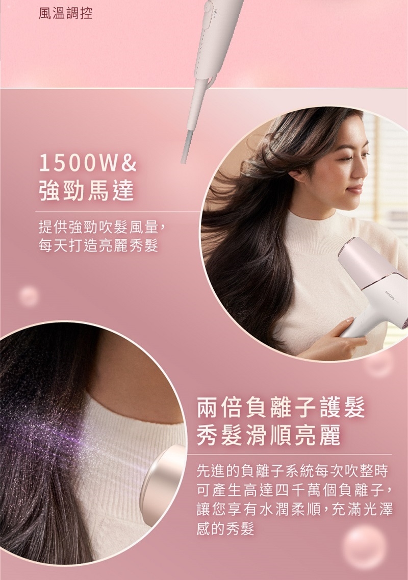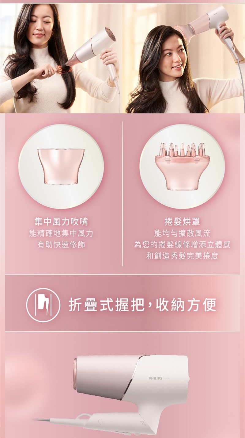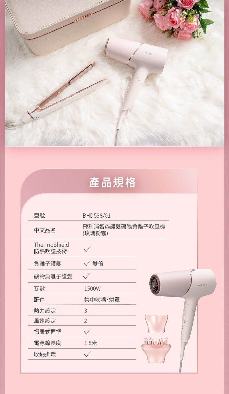 【Philips飛利浦】BHD538/01智能護髮礦物負離子吹風機(玫瑰粉霧)