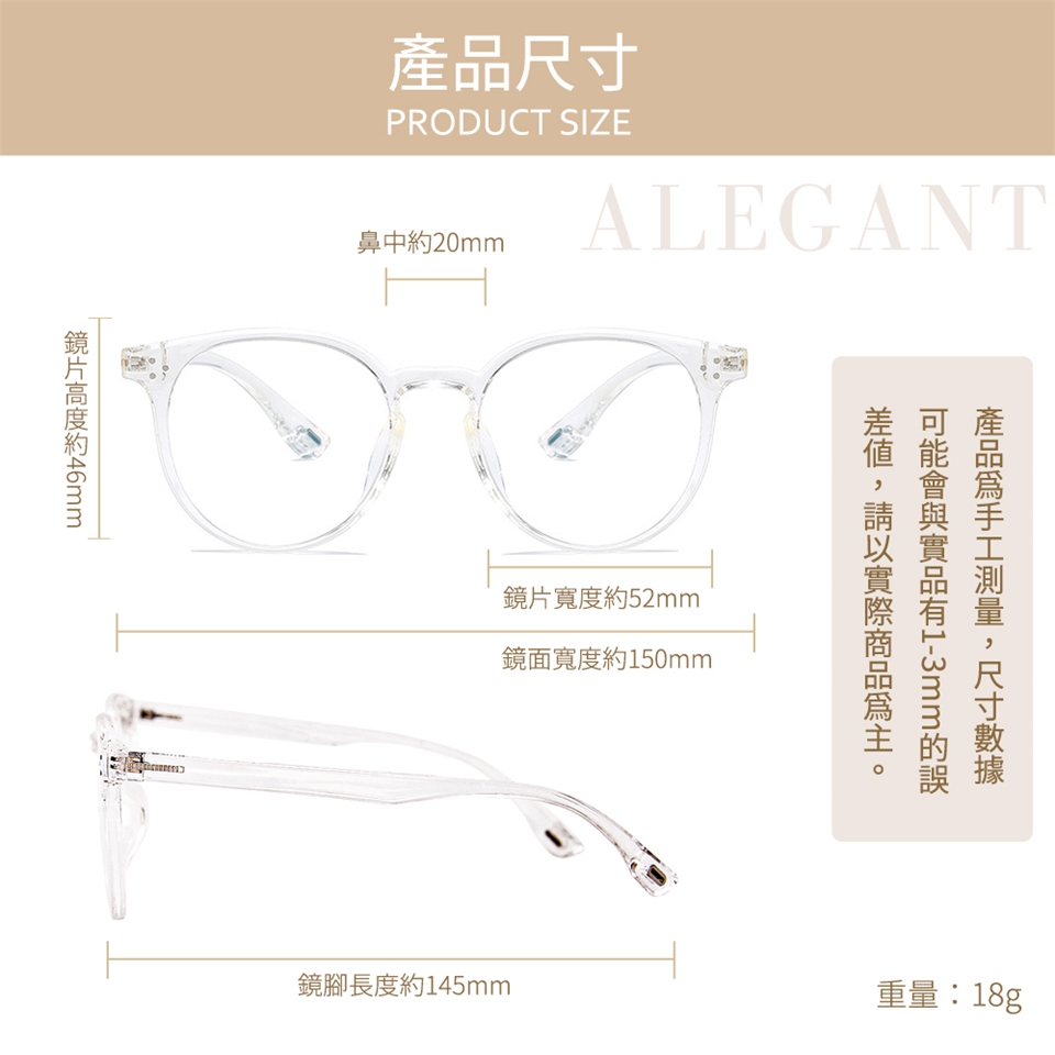 注意事項: 1. 眼鏡為精品配件並非珠寶類商品,鏡架稍有刮損視為正常現象並非瑕疵。 2. 網頁商品顏色會因為解析度不同,或使用不同品牌的螢幕,造成顏色略有不同,請以實品顏色為準。3. 本產品為無度數平光眼鏡,非屬醫療器材中的視力矯正處方眼鏡。 4. 鏡片清潔以清水沖洗再做擦拭,以降低鏡片刮傷的風險產生。