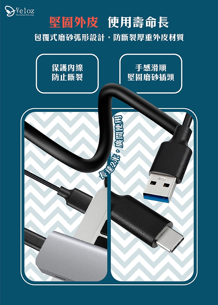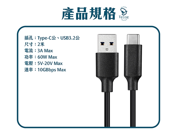 商品詳細介紹 【Veloz】Type-C/USB3.2數據傳輸充電線(velo-29)快速USB-C 3.2 10Gbps傳輸泛用性廣泛,Type-C配合USB可使用多種器材堅固穩定外皮材質與插頭使用,充電/傳輸/轉換 都可兼容 體驗說明 不可體驗 使用方法說明 無 注意事項 無