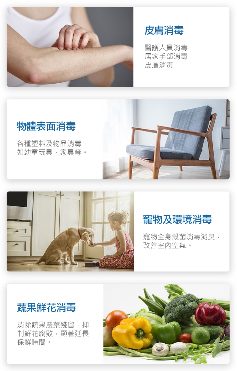1.用於環境消毒時環保又安全,清潔不傷手,消毒過後的物品,不需再用水清洗,只需靜待風乾後即可使用。