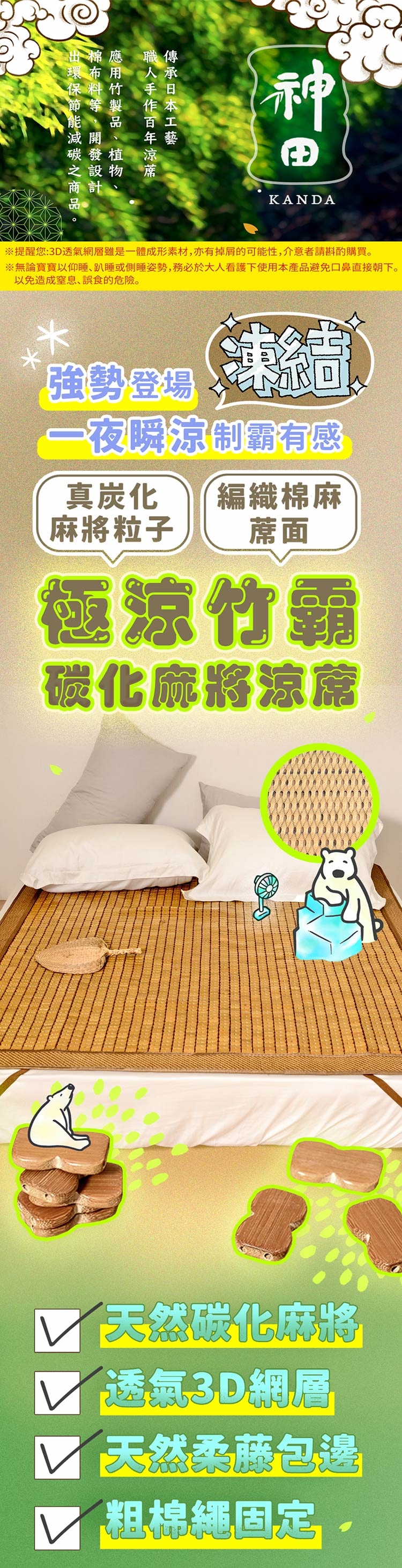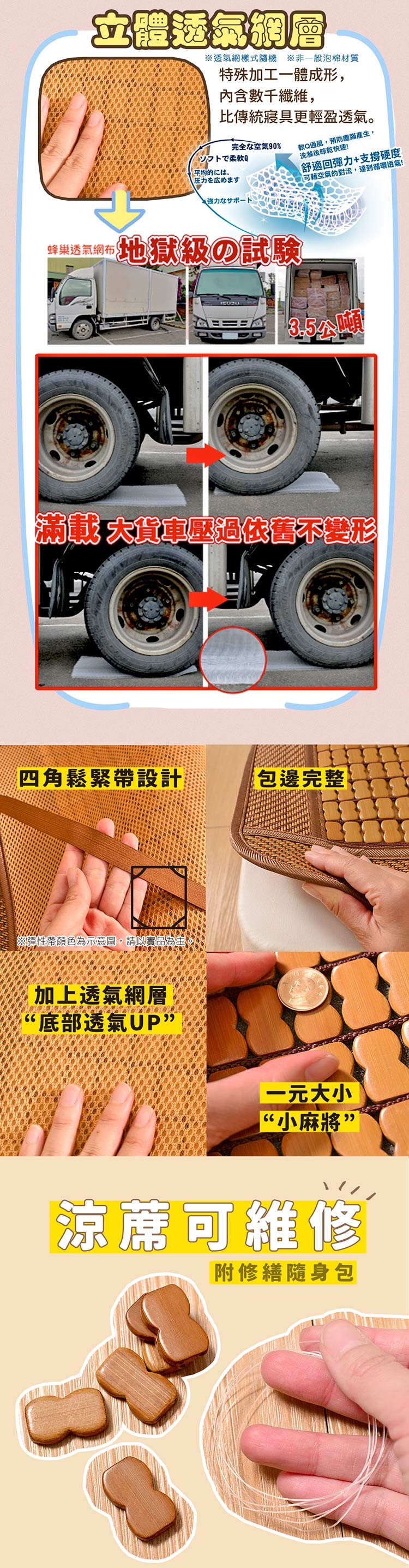 ※為防止涼蓆滑落,涼蓆長度特別設計製作略小於床墊,不是偷工減料哦。