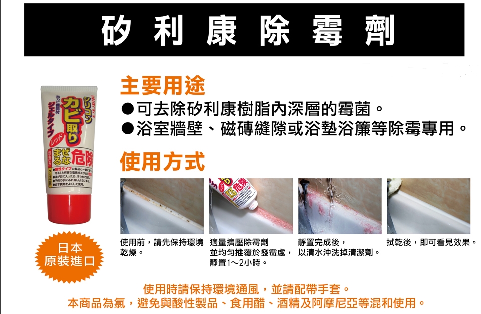 用 途:Silicon樹脂部分、浴室牆壁或磁磚細縫、墊、浴簾除霉專用