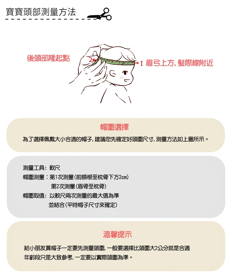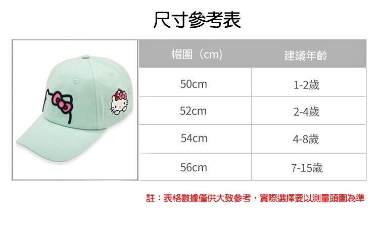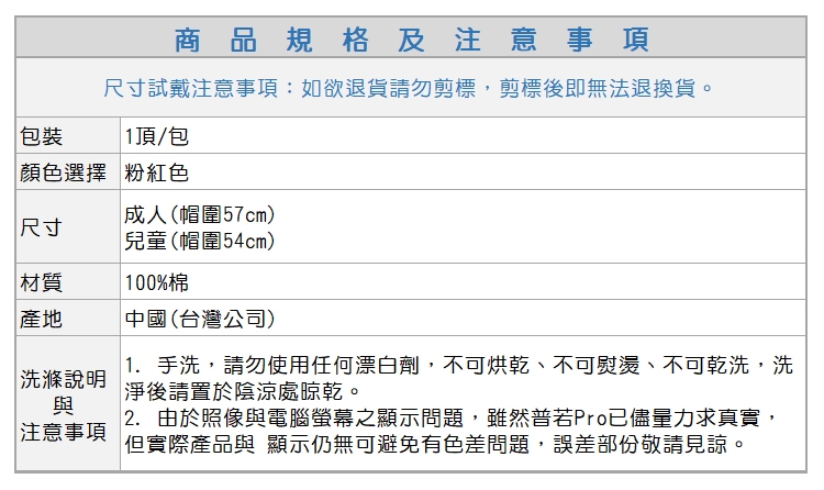 ● 尺寸:成人(帽圍57cm)、兒童(帽圍54cm)。