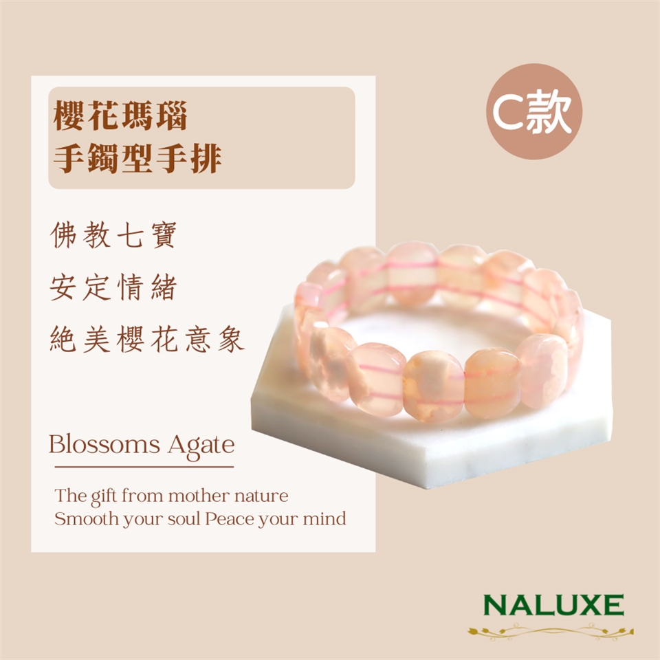 Naluxe精挑收藏等級櫻花瑪瑙,大尺寸更能彰顯獨特絕美的櫻花意象飄花。呈現出多彩而淡雅、溫潤而內斂的頂極表現,飽滿的色澤卻清透油亮,讓人愛不釋手。