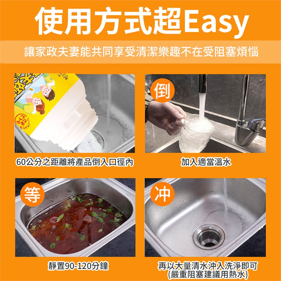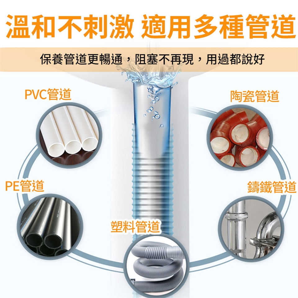 2.將本產品適量導入管內,洗手台、流理台建議80-100g,浴廁排水孔、主要管道約100-150g 五分鐘後倒入大