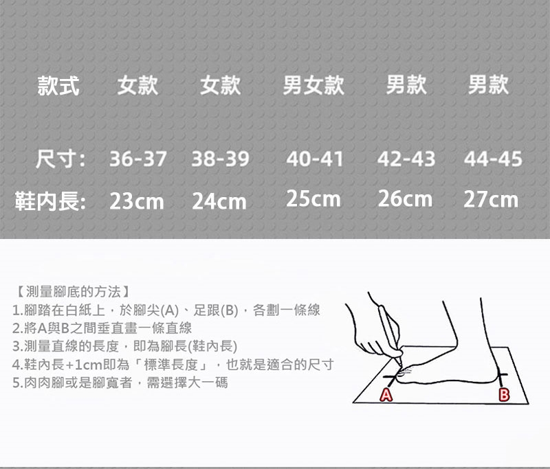 *溫馨提醒:購買前務必測量腳底長度,對照圖中鞋內長,選擇適合尺寸
