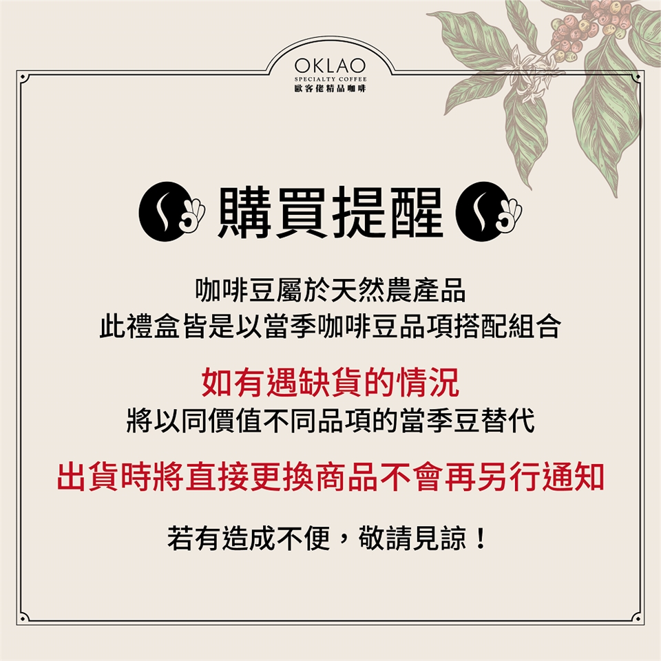 ⚠️ 請務必詳看購買提醒! (1)咖啡豆屬於天然農產品,此批禮盒(咖啡豆/精品掛耳)皆是以全新產季的新鮮豆品項搭配組合,如有遇缺貨的情況,將以同價值不同品項的當季豆替代,若有造成不便敬請見諒!!